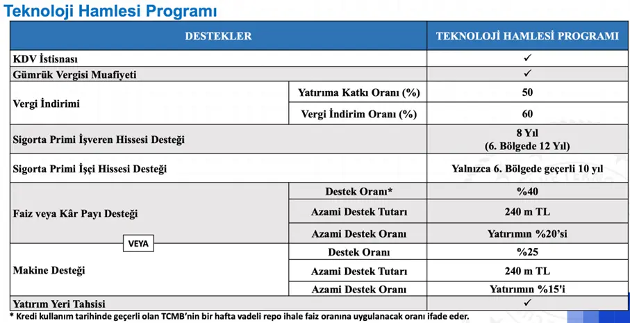 Programın Temel Amacı: Teknoloji Hamlesi Programı; Türkiye’nin orta-yüksek ve yüksek teknolojili ürünlerde yerli üretim kapasitesini artırmayı hedefler. Program, özellikle ithalat bağımlılığı yüksek, küresel rekabet gücü taşıyan ve Ar-Ge yoğun ürünlere odaklanır.